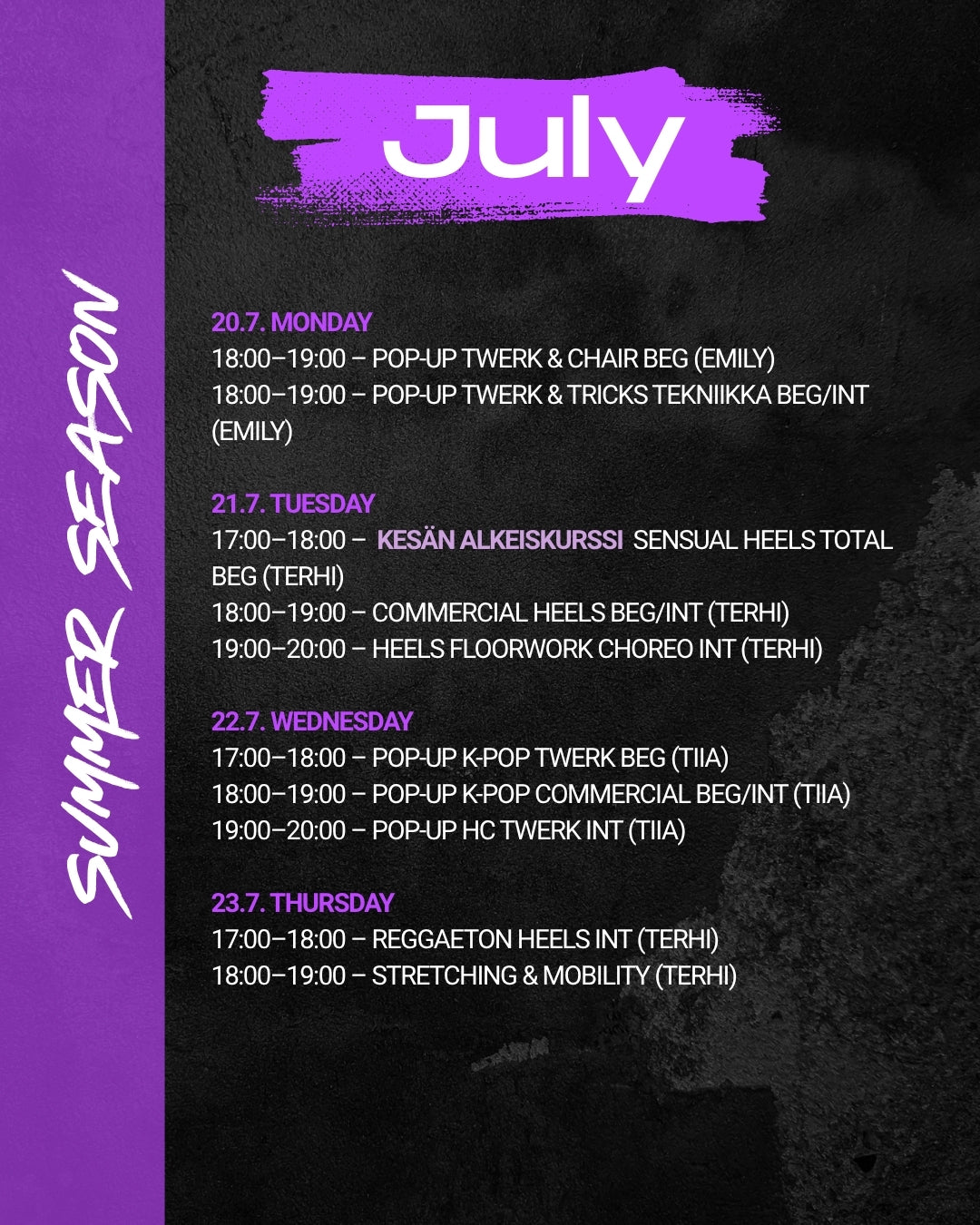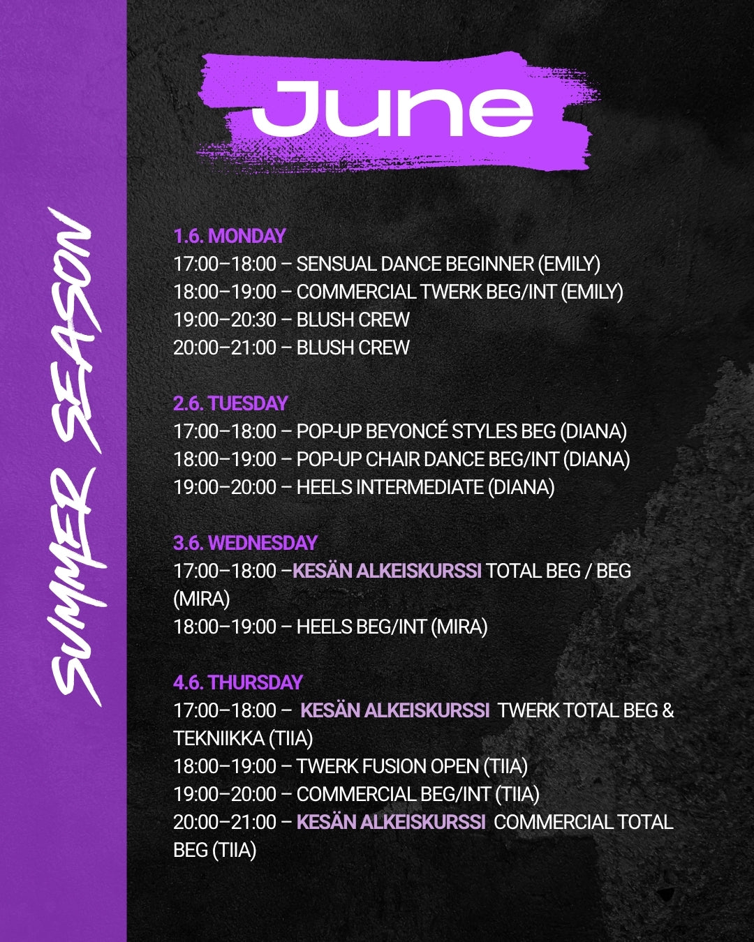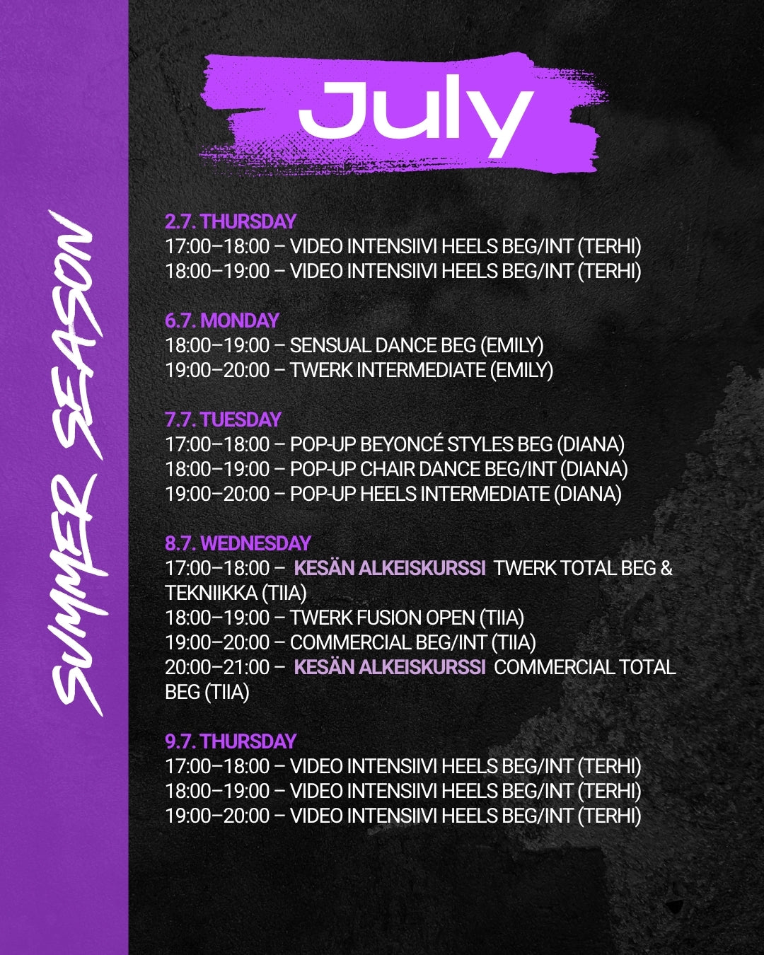 Kesällä järjestämme total beginner tasoisia alkeiskursseja. Tyylilajit: Twerk, heels ja commercial. Aloita uusi tanssiharrastus kesällä ✨ Huom! Total Beginner tunneille ovat tervetulleita uudet sekä vanhat oppilaamme, mutta uudet oppilaat voivat ostaa kurssit tutustumishinnalla ✨ Alkeistuntien kortteja ei voi käyttää muille tunneille.