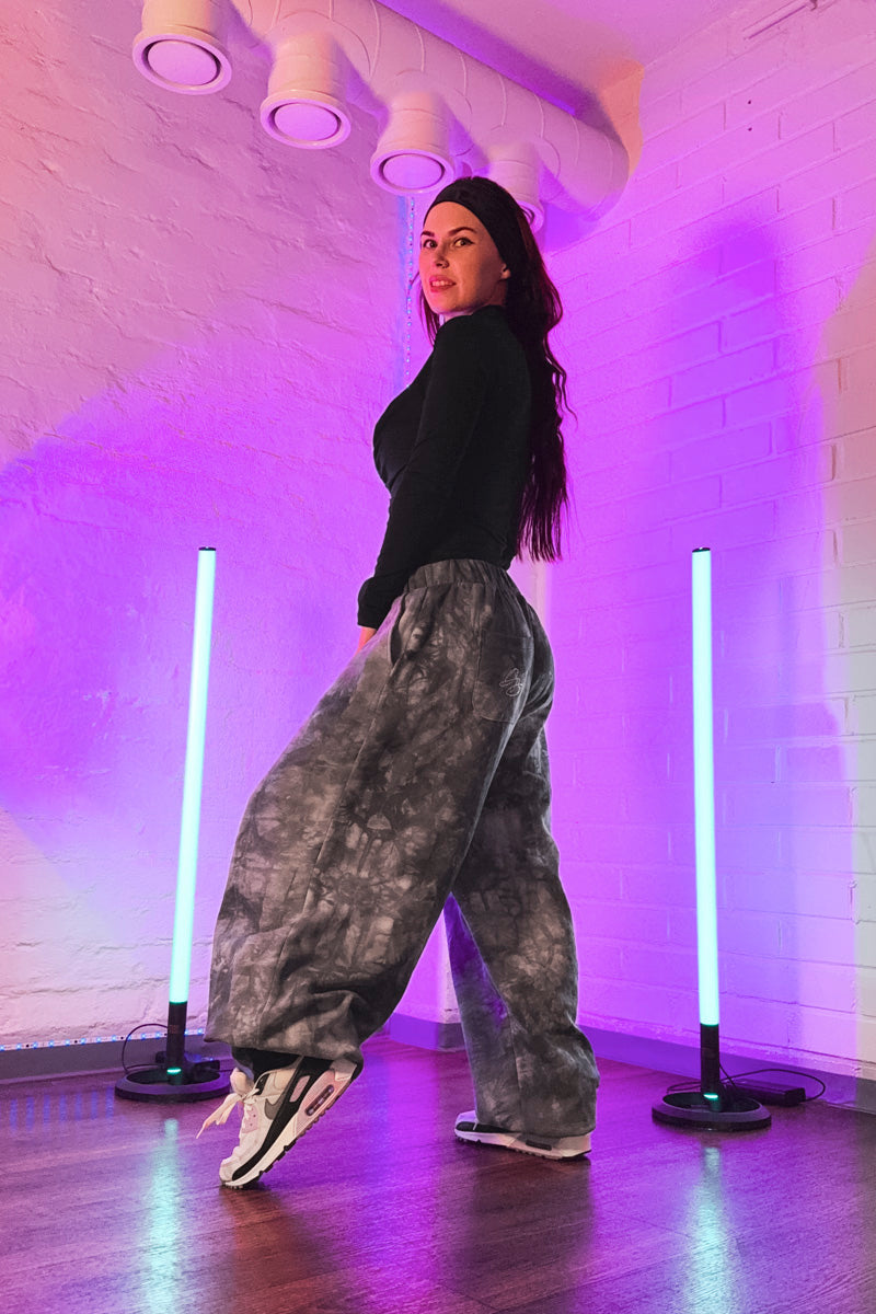 Nämä harmaan sävyiset tie-dye sweatpantsit ovat täydellinen valinta tanssiin ja vapaa-aikaan. Baggy-mallinen housu on valmistettu kevyestä harjatusta collegesta ja malli on oversized – jos haluat extra baggyn lookin, valitse vielä kokoa suurempi tuote. Jokaisessa tuotteessa on takatasku, jossa on DB Signature rhinestone logo. Tuotteessa ei ole sivutaskuja vakiona, mutta voit lisätä ne tuotteen kustomoinnilla.