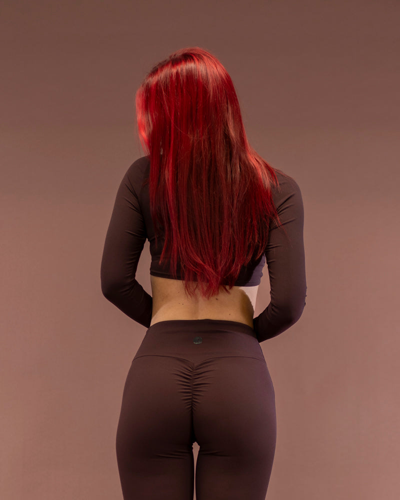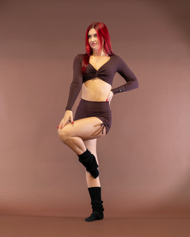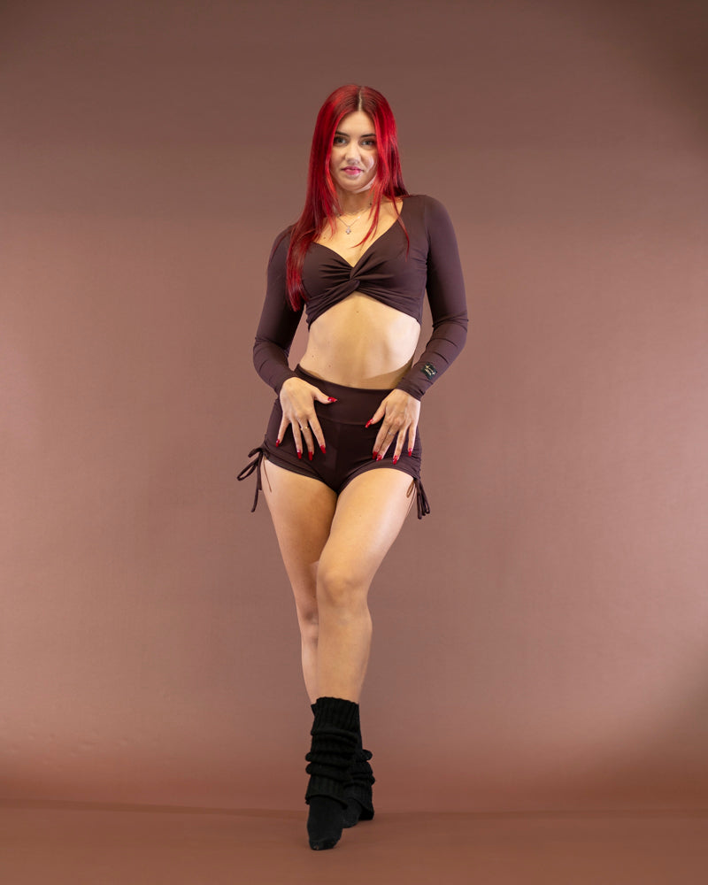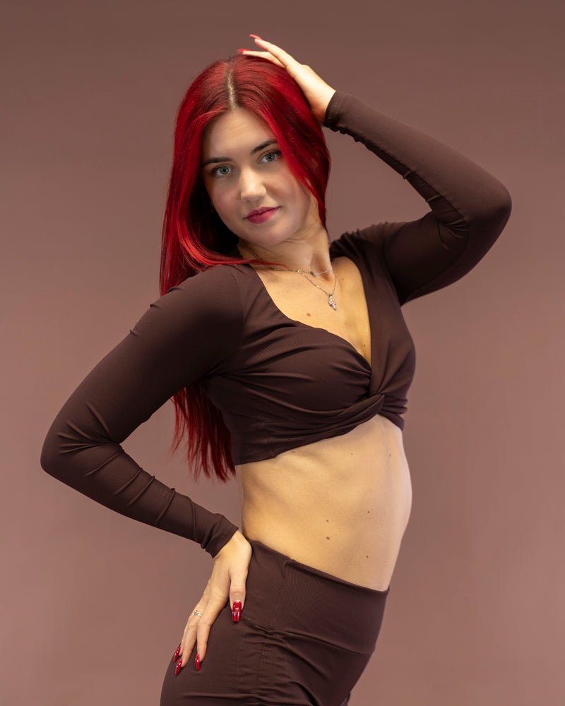 Saga Twist Shirt on valmistettu joustavasta rib materiaalista, joka on erittäin miellyttävä käytössä. Kaunis Espresso Brown sävy taittaa tummanruskeasta hieman viininpunaiseen. Ribbi on tyylikäs valinta niin liikuntaan kuin vapaa-aikaankin. Kangas on todella miellyttävä ja kevyt, soveltuen täydellisesti myös tanssiin. Vasemmassa hihassa on kaunis kudottu DB kangasmerkki.