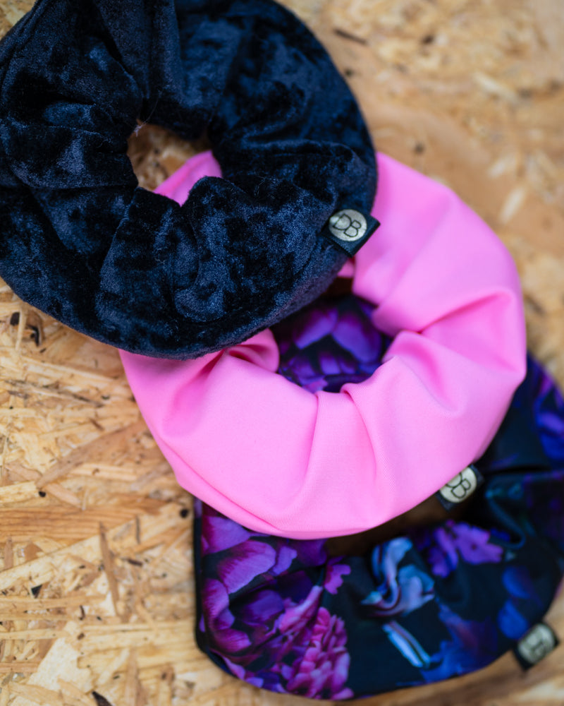 The beautiful Chichilla package contains three plush scrunchies: Bloom, Adenium Pink and Black Velvet donuts. The scrunchies are made in Lahti. A simple scrunchie beautifully decorates a bun, but it can also be used double or triple.
