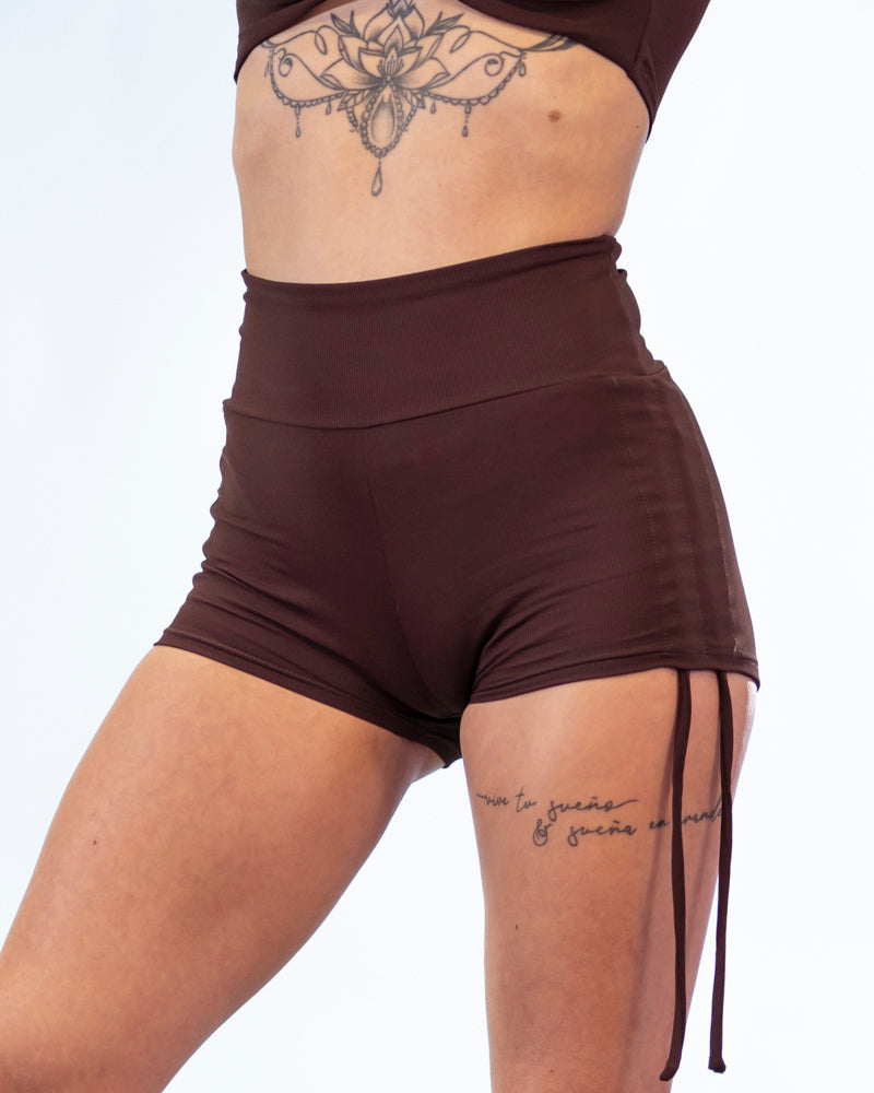 The Savanna shorts feature beautiful drawstring ties on the sides of the legs, with a design that covers the hips, making them suitable for various activities. These shorts are made from a wonderfully luxurious ribbed fabric that feels incredibly comfortable to wear. The shorts are stylish, well-fitting, and neat, perfect for summer street style as well as for dance.